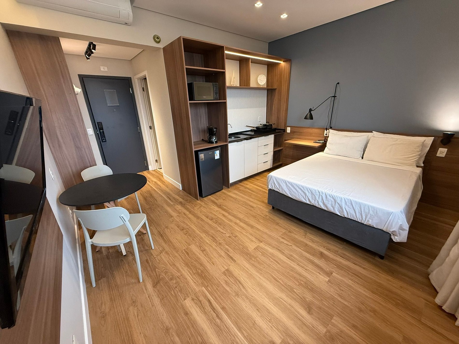 Um espaço novo, recém reformado e mobiliado para sua comodidade. Com cozinha, ar condicionado, Wi-Fi, TV a cabo. Em um condomínio a uma quadra da praia com piscina, academia, sauna, mini mercado e estacionamento.