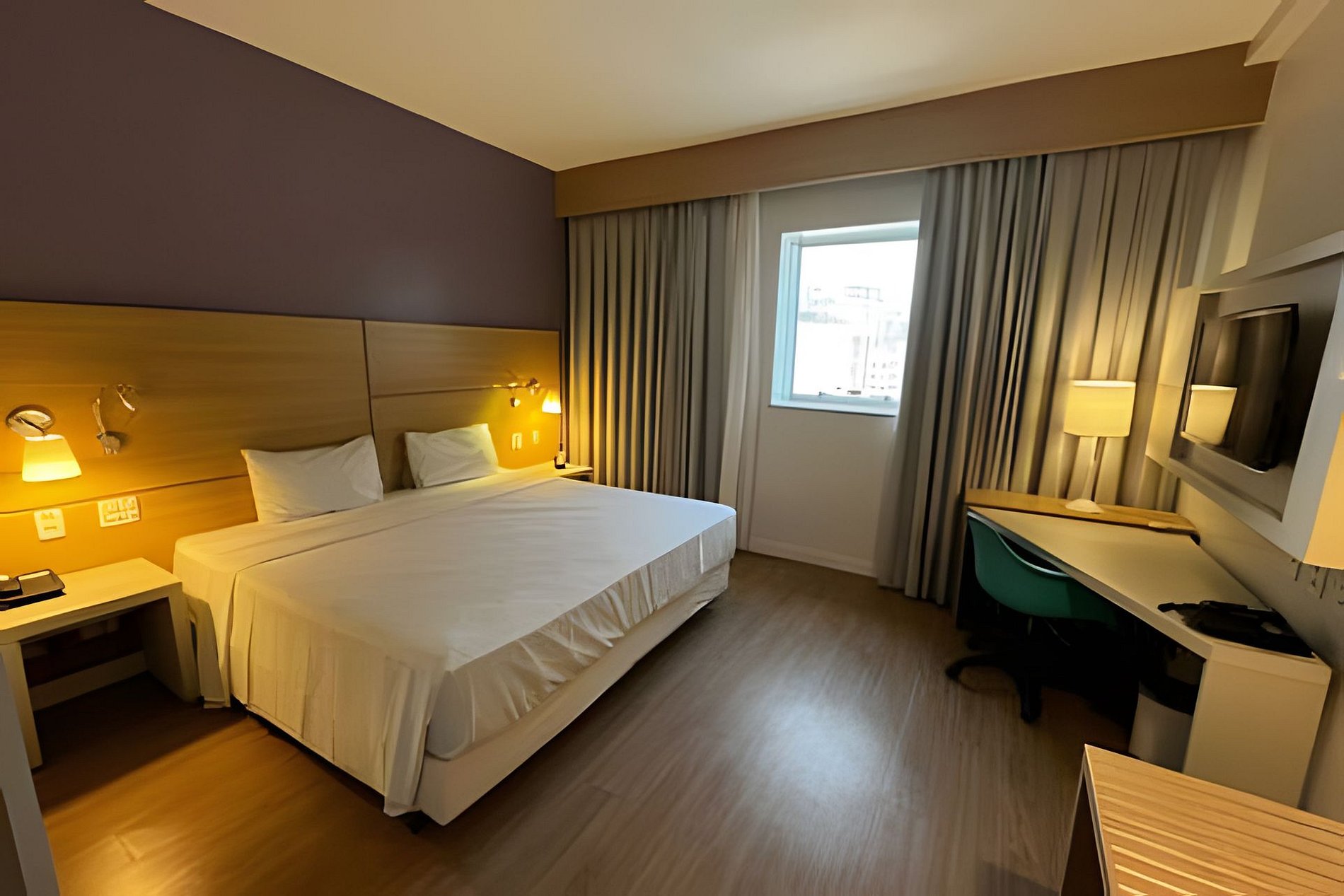Possui cama KING, que acomodam 2 adultos e 1 crianca. Arrumação de quarto todos os dias, recepção 24hr, tudo para que seu bem estar! Contamos com ar condicionado, cofre e Internet Wifi,grátis além de Mesa de Trabalho, secador de cabelo, TV Smart
