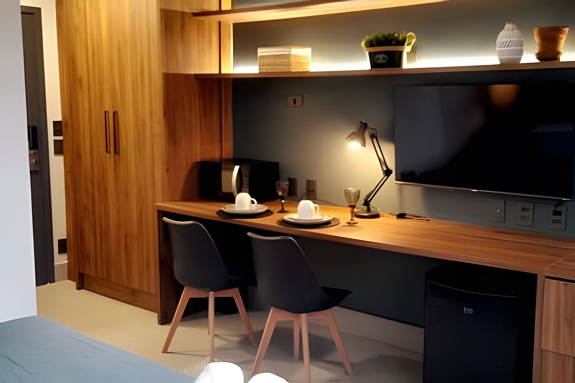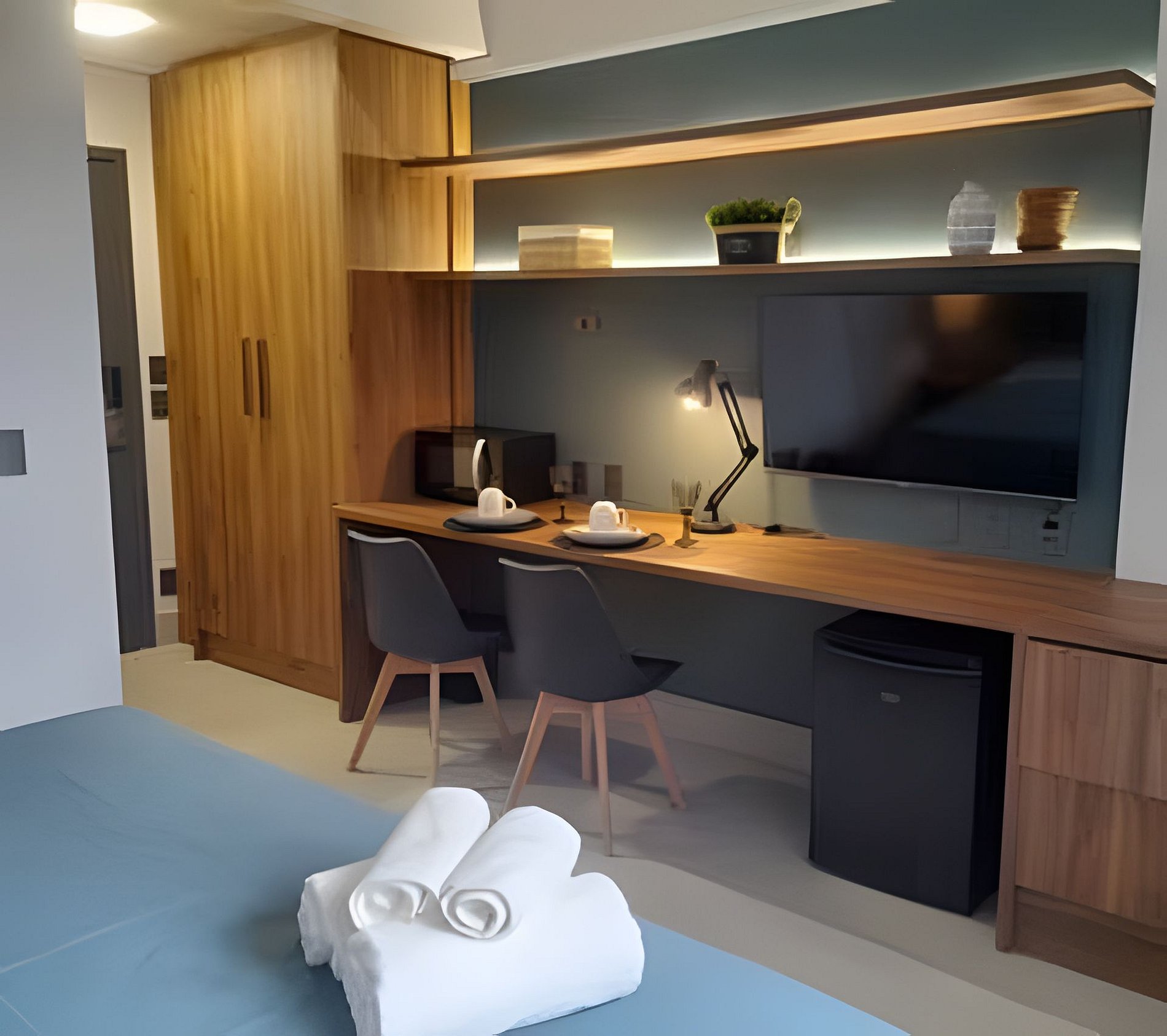 Ideal para lazer ou trabalho o studio com 24m oferece Cama casal KING Wi fi Smart tv 43 Ar condionado Frigobar Forno microndas , copos e talheres p 2 pessoas . Banheiro completo com secador de cabelo . Esta incluido: roupa de cama, travesseiros e toalhas ( não fornecemos toalhas para a praia) cobertor , itens basicos de higiene. O condominio oferece academia vista mar , sauna, piscina , espaço para reunioes e o estacionamento é pago a parte.