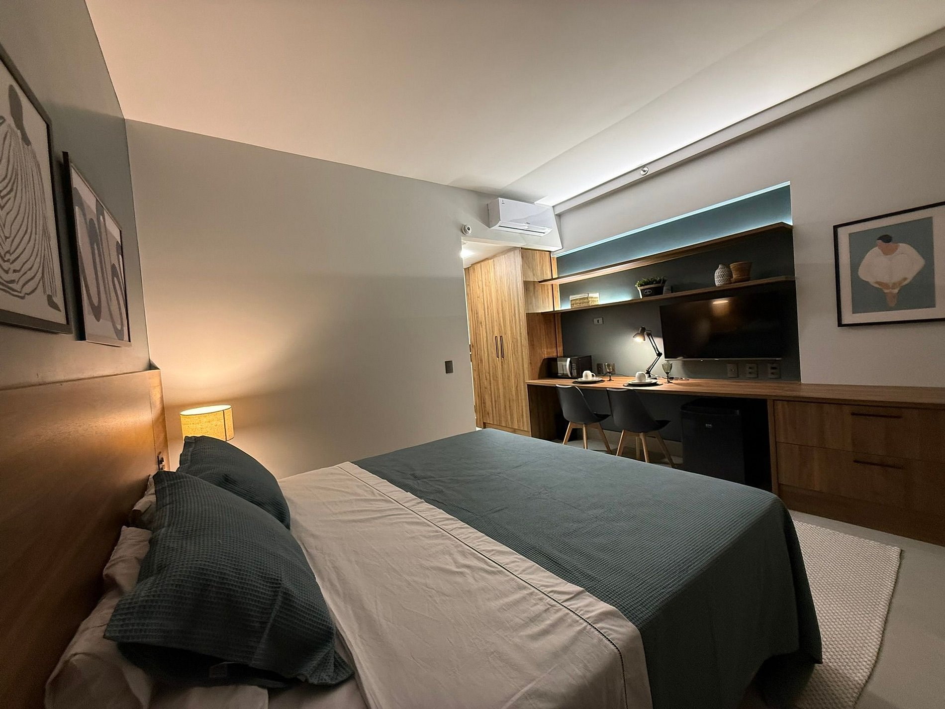 Possui cama KING, que acomodam 2 adultos e 1 crianca de até 7 anos. Arrumação de quarto todos os dias, recepção 24hr, tudo para que seu bem estar! Contamos com ar condicionado, microondas e pratos e talheres para 2 pessoas, Internet Wifi,grátis além de secador de cabelo, TV Smart 43, e espaço para trabalhar