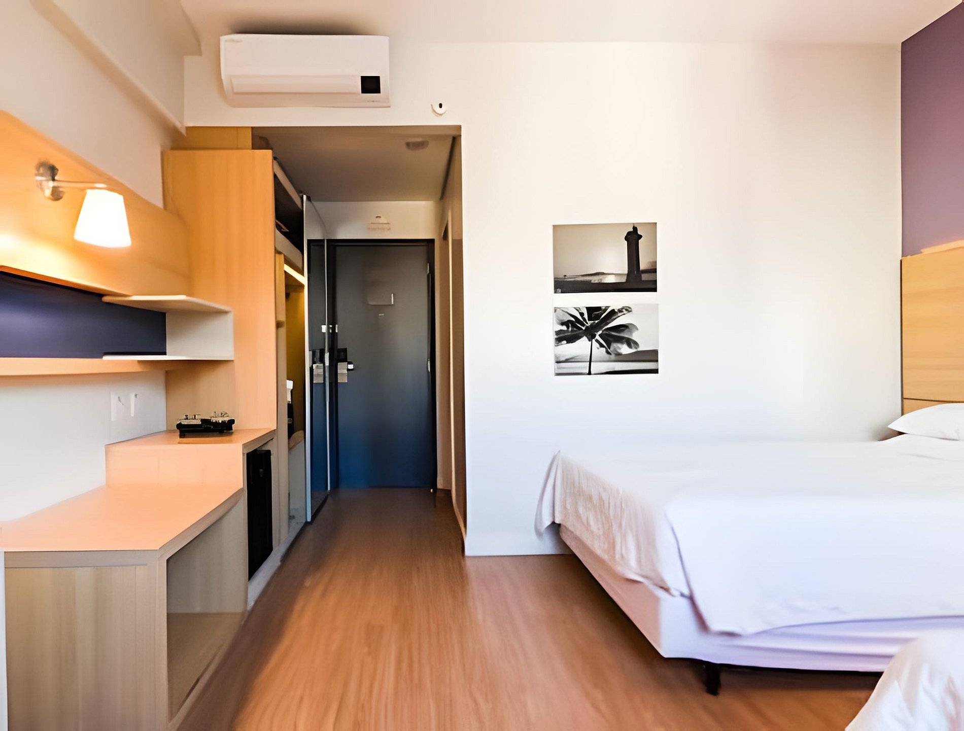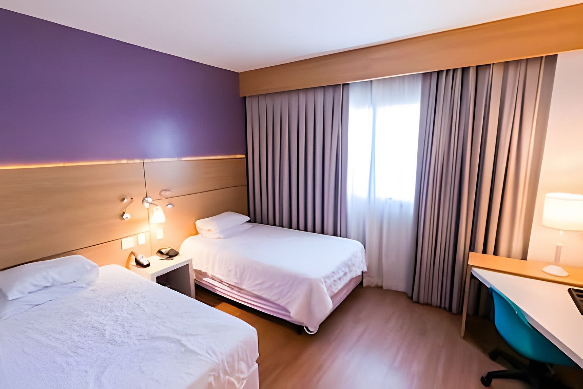 Possui 2 camas de viúva, que acomodam 2 adultos e 2 criancas (1 adulto e 1 criança em cada cama) ou até mesmo 2 casais pequenos. Recepção 24hr, tudo para que seu bem estar! Contamos com ar condicionado, cofre e Internet Wifi, além de Mesa de Trabalho, secador de cabelo, TV Smart.