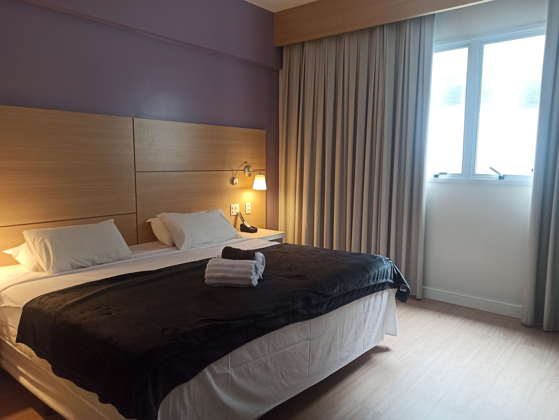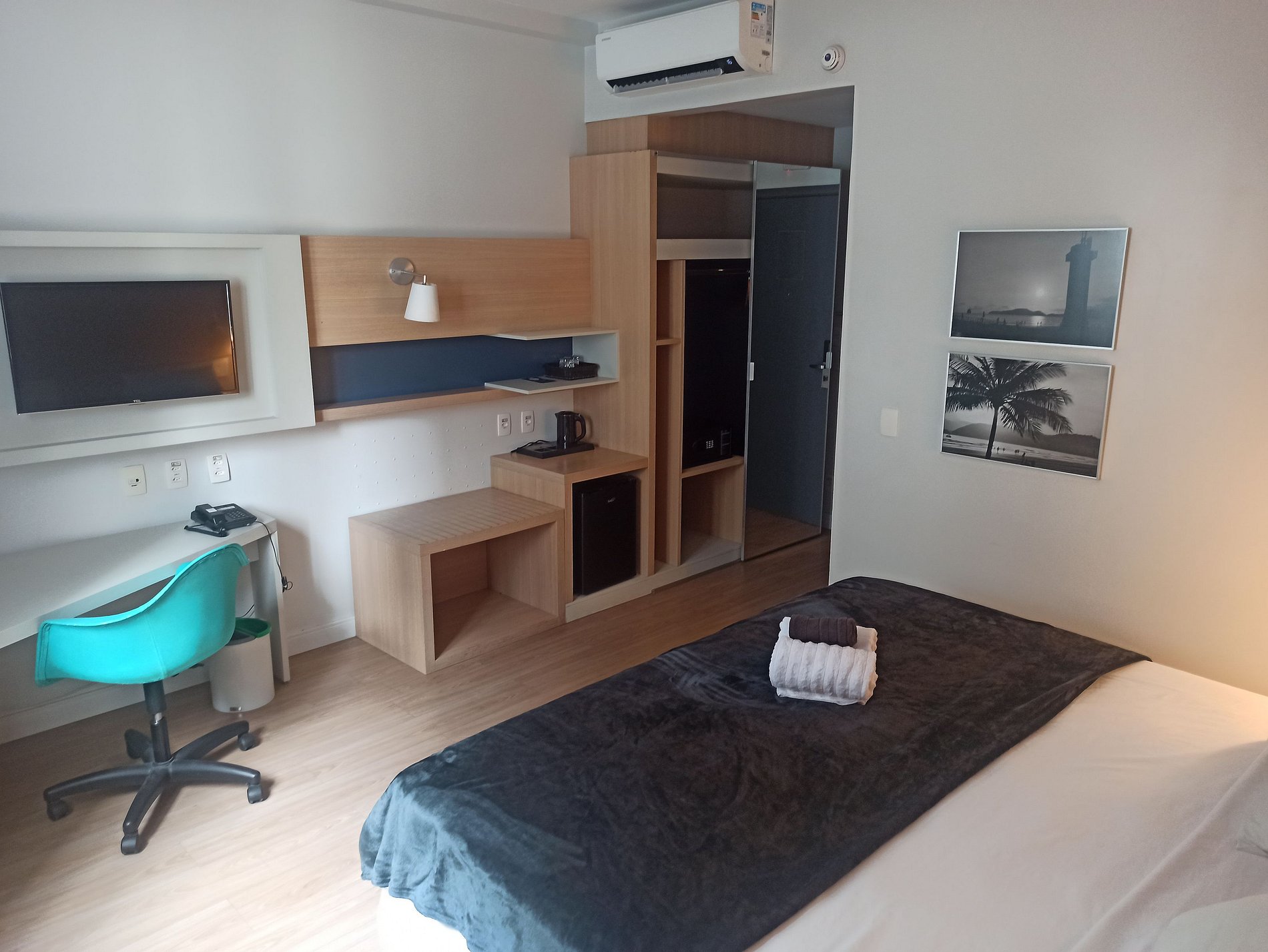 Cama KING size que acomodam 2 adultos e 1 criança até 6 anos. Recepção 24hr. Ar condicionado e Internet Wifi grátis, cofre, área de trabalho, secador de cabelo, TV Smart, frigobar e Chaleira