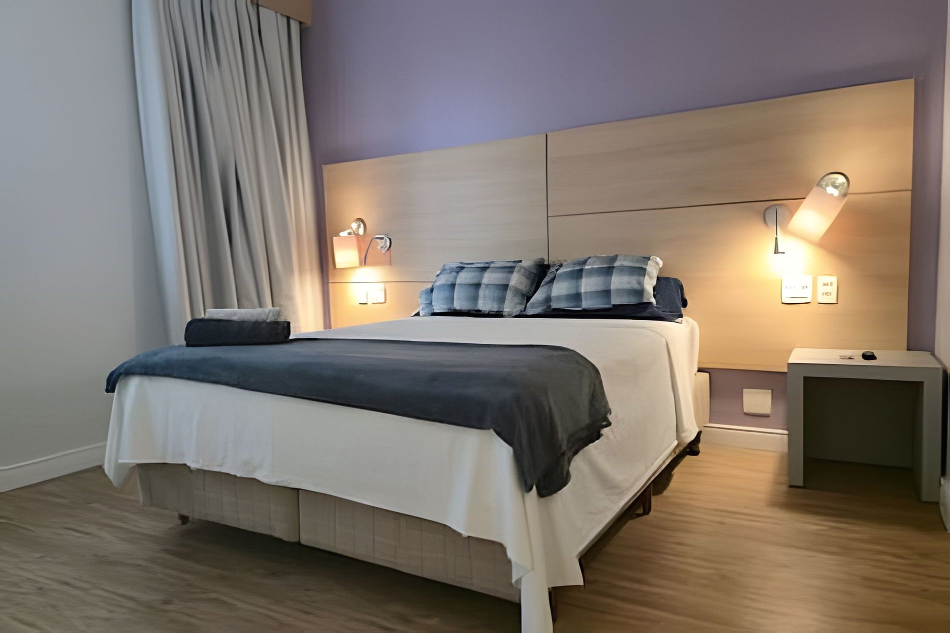 Possui cama KING, que acomodam 2 adultos e 1 crianca. Recepção 24hr, tudo para que seu bem estar! Contamos com ar condicionado, cofre e Internet Wifi,grátis além de Mesa de Trabalho, secador de cabelo, TV Smart