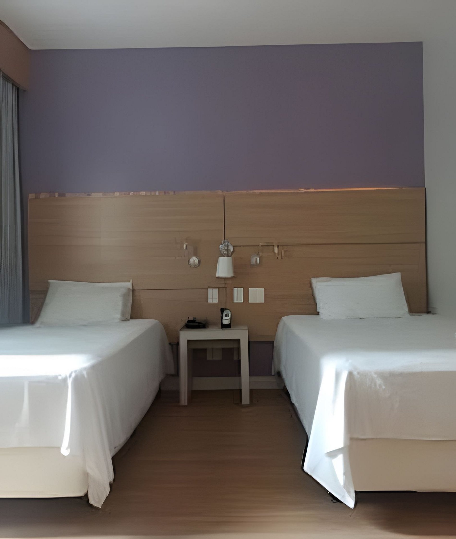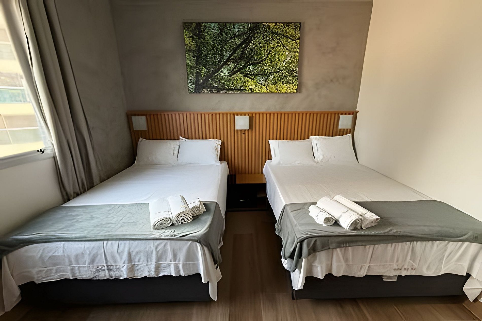 Possui 2 camas de viúvo, que acomodam 1 adulto e 1 crianca em cada ou 4 adultos pequenos. Recepção 24hr, tudo para que seu bem estar! Contamos com ar condicionado, cofre e Internet Wifi,grátis além de Mesa de Trabalho, secador de cabelo, TV Smart