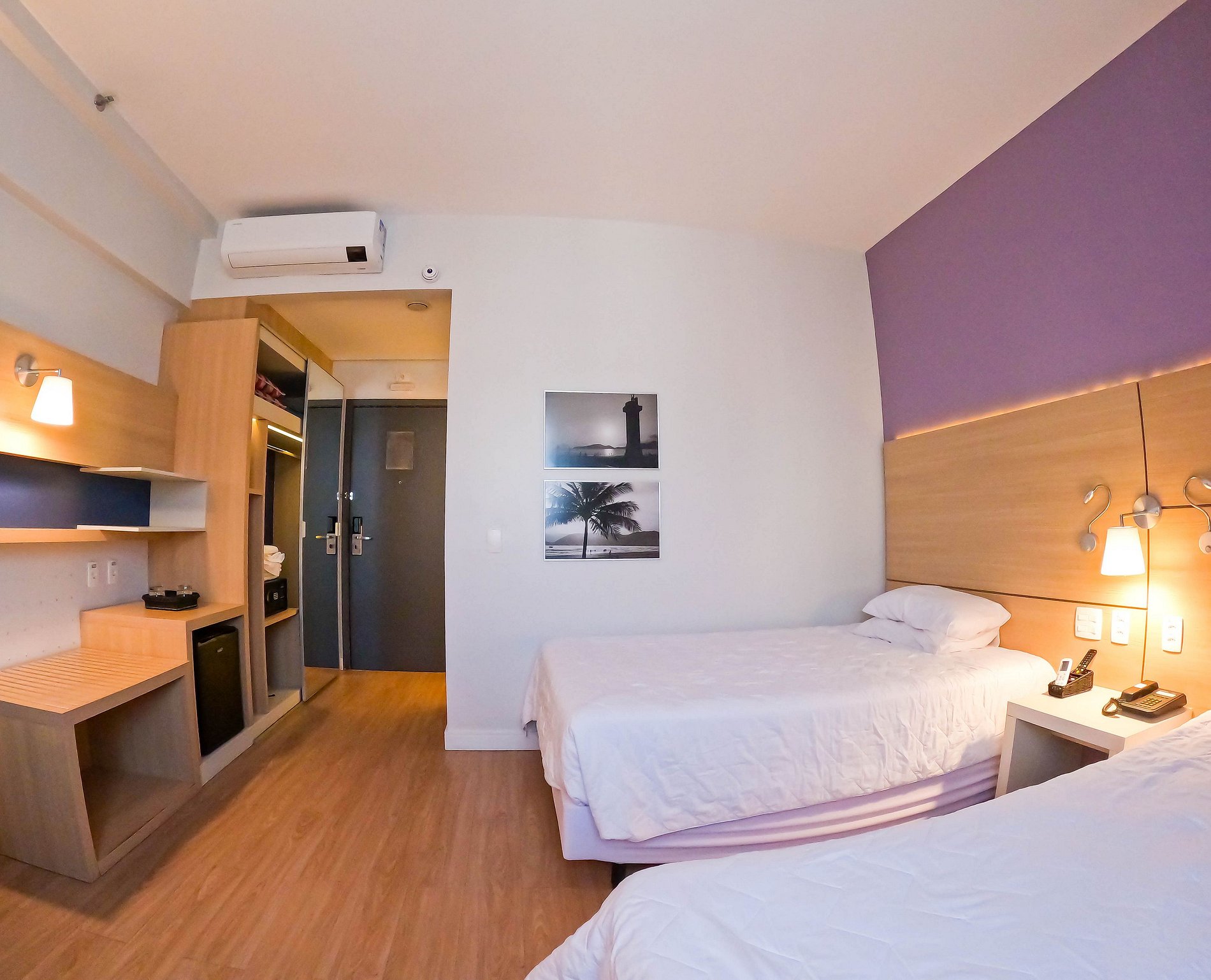 Possui 2 camas de viúva, que acomodam 2 adultos e 2 criancas (1 adulto e 1 criança em cada cama) ou até mesmo 2 casais pequenos. Recepção 24hr, tudo para que seu bem estar! Contamos com ar condicionado, cofre e Internet Wifi, além de Mesa de Trabalho, secador de cabelo, TV Smart.