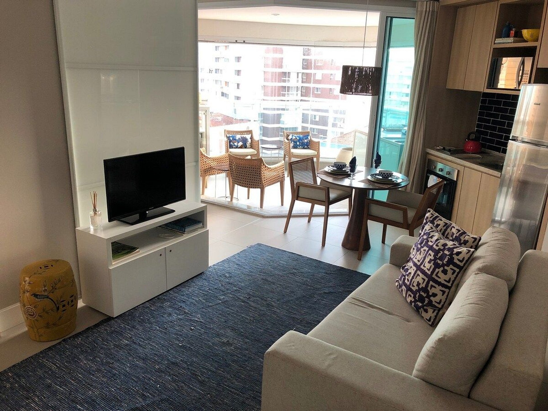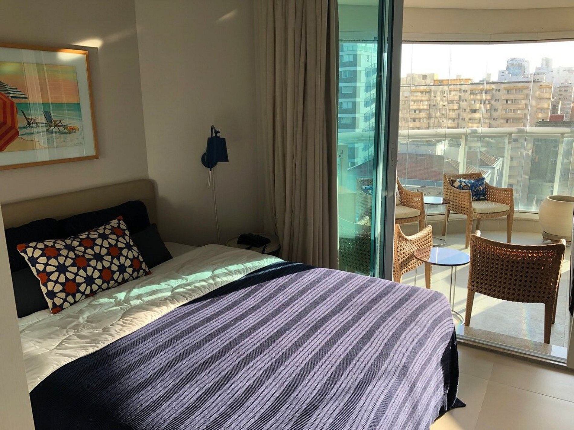 Viaje com o conforto de sua casa de Praia. A uma quadra da praia, ideal para passeio e ate mesmo a trabalho. Arrumação do apto todos os dias (exceto domingos e feriados), recepção 24hr, auxílio para manutenções do dia a dia, tudo para que seu bem estar! Contamos com um quarto com cama Queen e sofá cama na sala, acomodamos até 4 pessoas! Ar condicionado no quarto e na sala. Internet WiFi e TV a cabo na sala e no quarto. TV do quarto conta com Chrome Cast para que utilize a TV como Smart