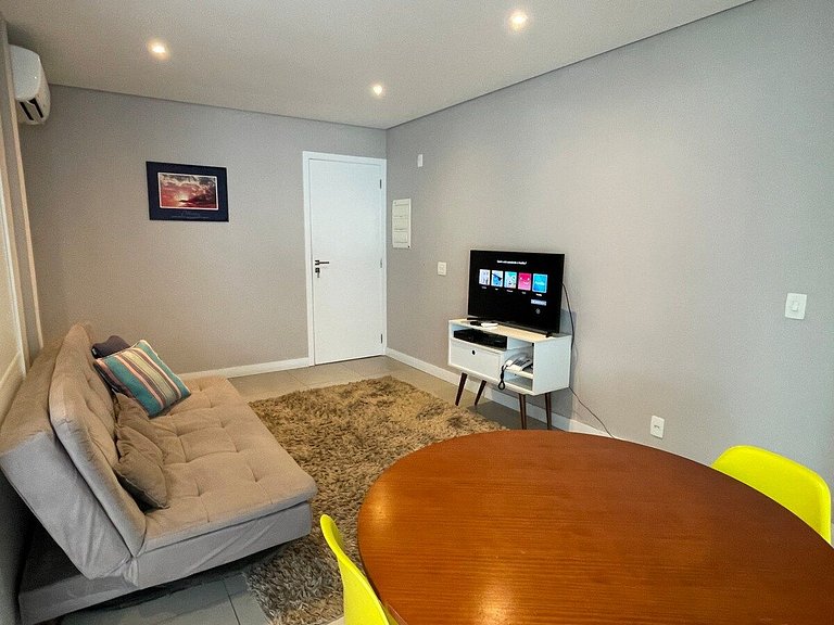 Viaje com o conforto de sua casa de Praia. Na quadra da praia, sendo 3 minutos caminhando 200m, ideal para passeio e ate mesmo a trabalho. Recepção 24hr, auxílio para manutenções do dia a dia, tudo para que seu bem estar! Contamos com um quarto com cama casal e 2 sofás cama na sala, acomodamos muito bem 4 pessoas! Ar condicionado no quarto e na sala. Internet WiFi 125Mb/s com TV a cabo na sala. Smart TV na sala e no quarto!!!