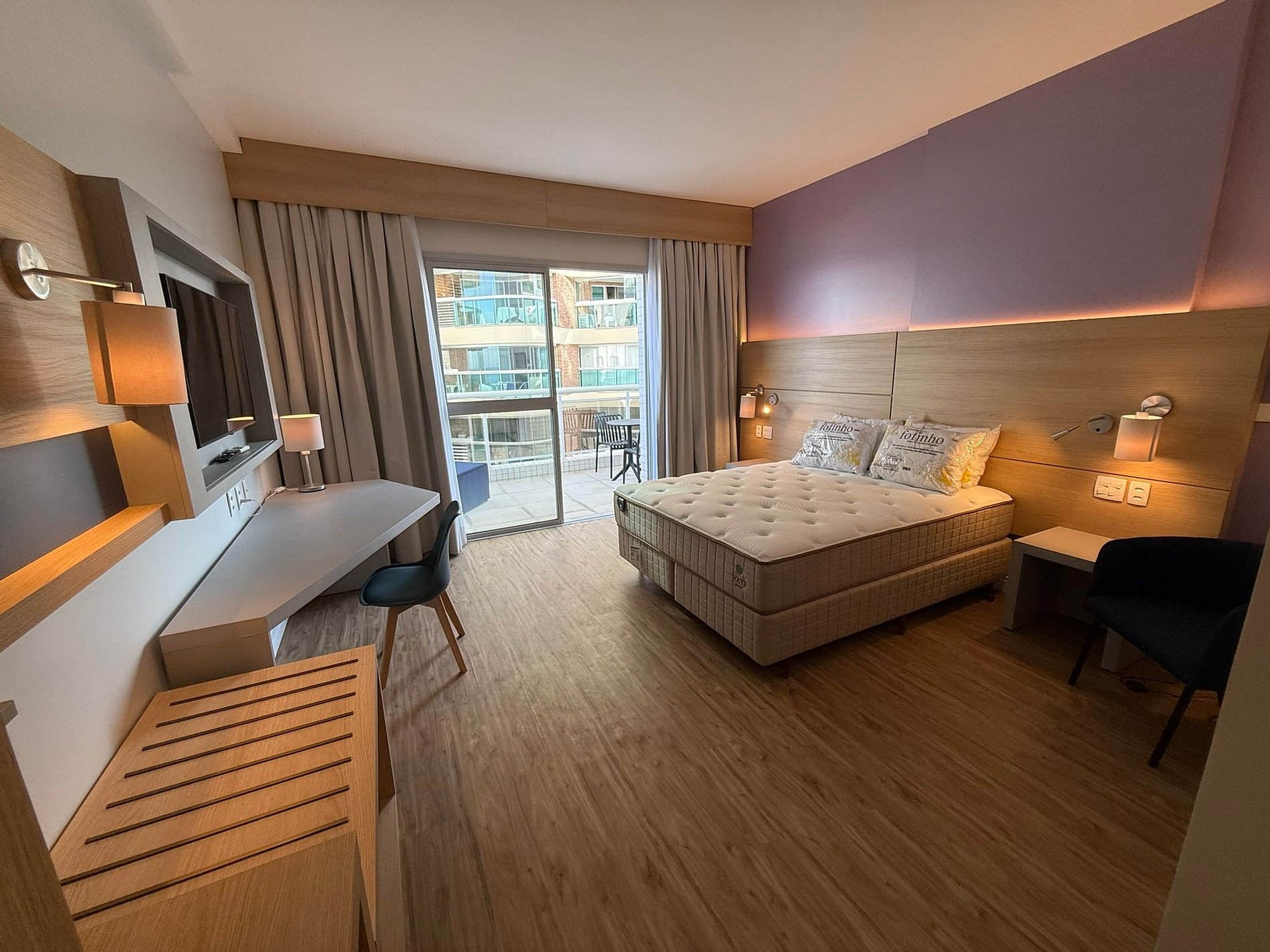 Possui cama QUEEN e varanda com Vista Mar. Arrumação de quarto todos os dias, recepção 24hr, tudo para que seu bem estar! Contamos com ar condicionado, cofre e Internet Wifi,grátis além de Mesa de Trabalho, secador de cabelo, TV Smart
