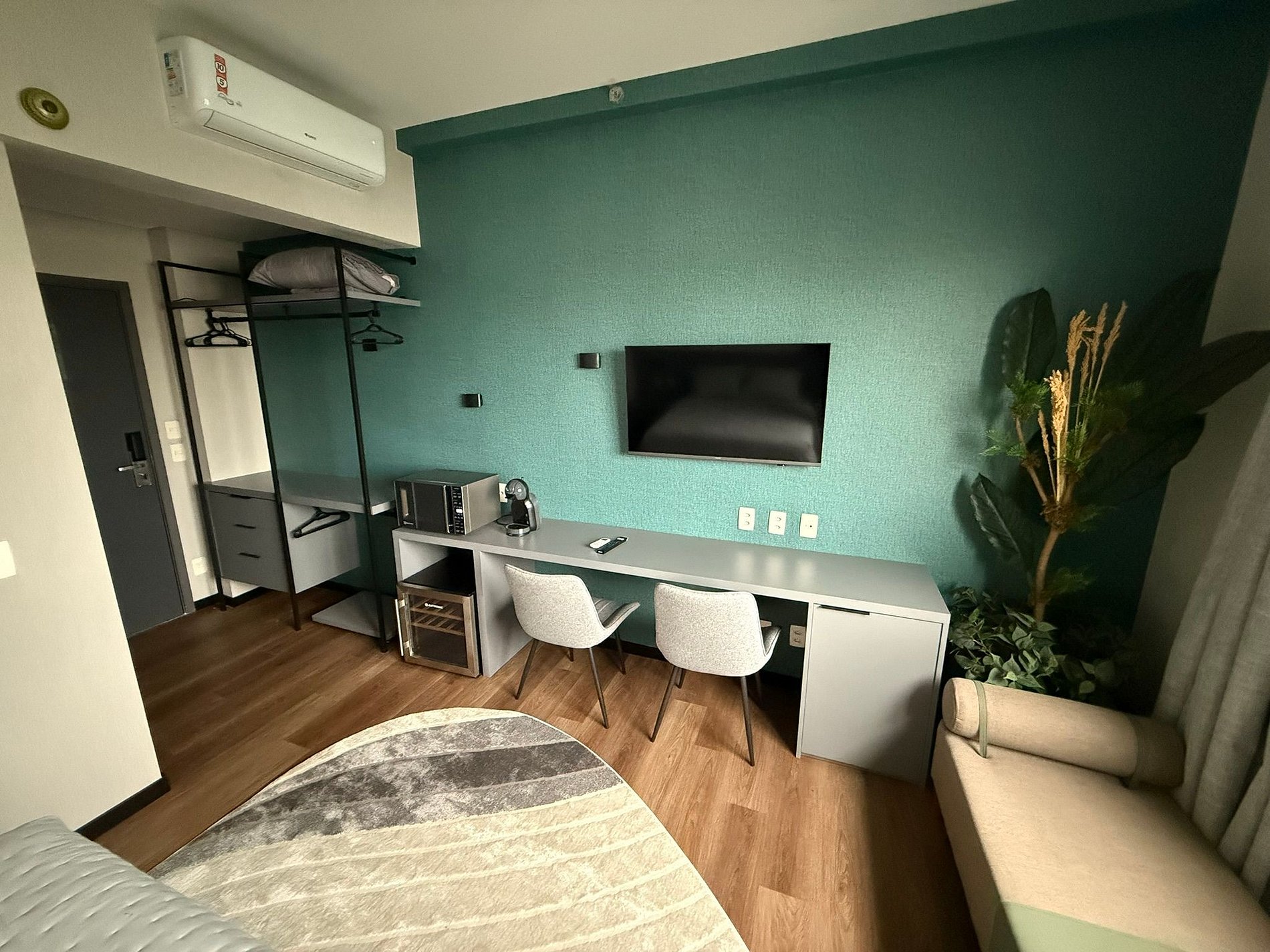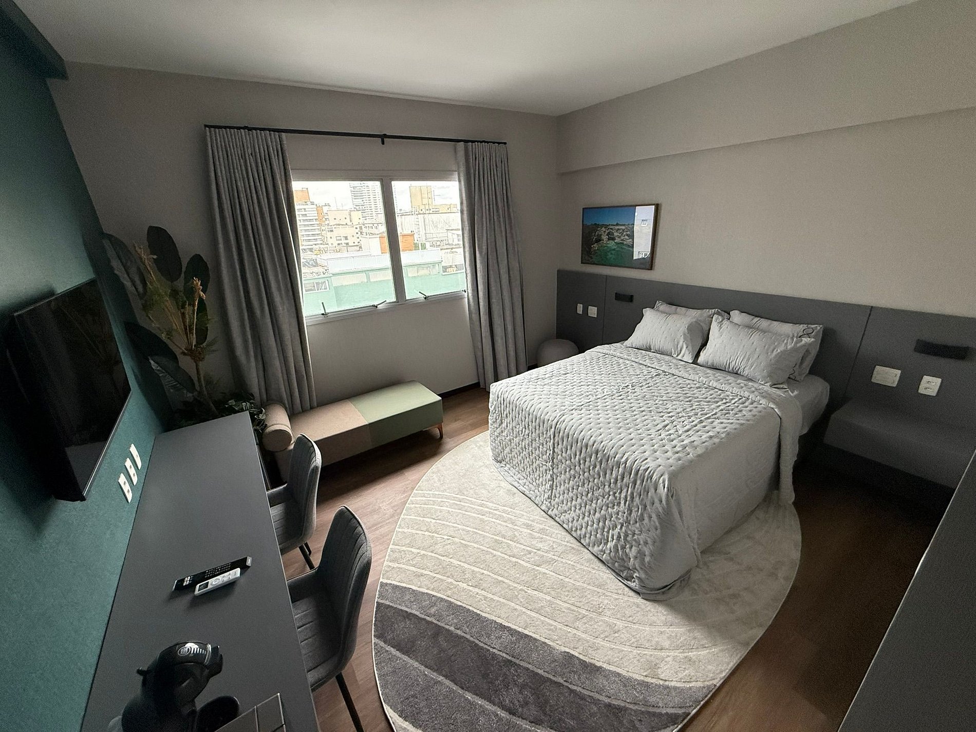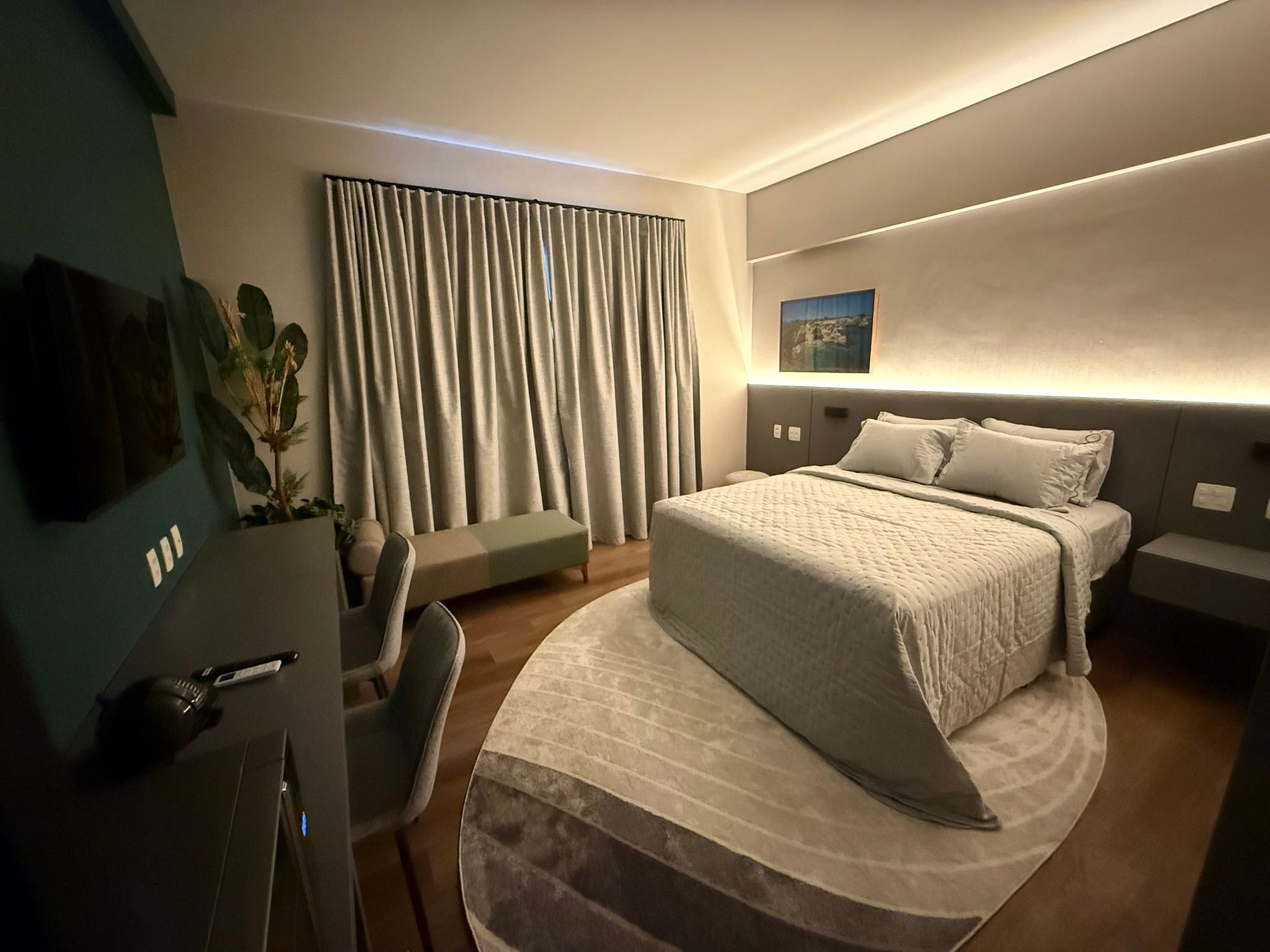 Na quadra da praia, atendemos executivos e lazer. Cama QUEEN com 1 cama de solteiro tipo bicama (embaixo) que acomoda 3 adultos. Arrumação de quarto todos os dias, recepção 24hr. Ar condicionado e Internet Wifi grátis, cofre, área de trabalho, secador de cabelo, TV Smart, adega de vimho que pode usar para refrescar seus alimentos e maquina de café 3 corações. Prédio com Academia e piscina com vista Mar e Sauna das 09hr as 21hr. estacionamento a 30,00 diária. minimercado no piso térreo