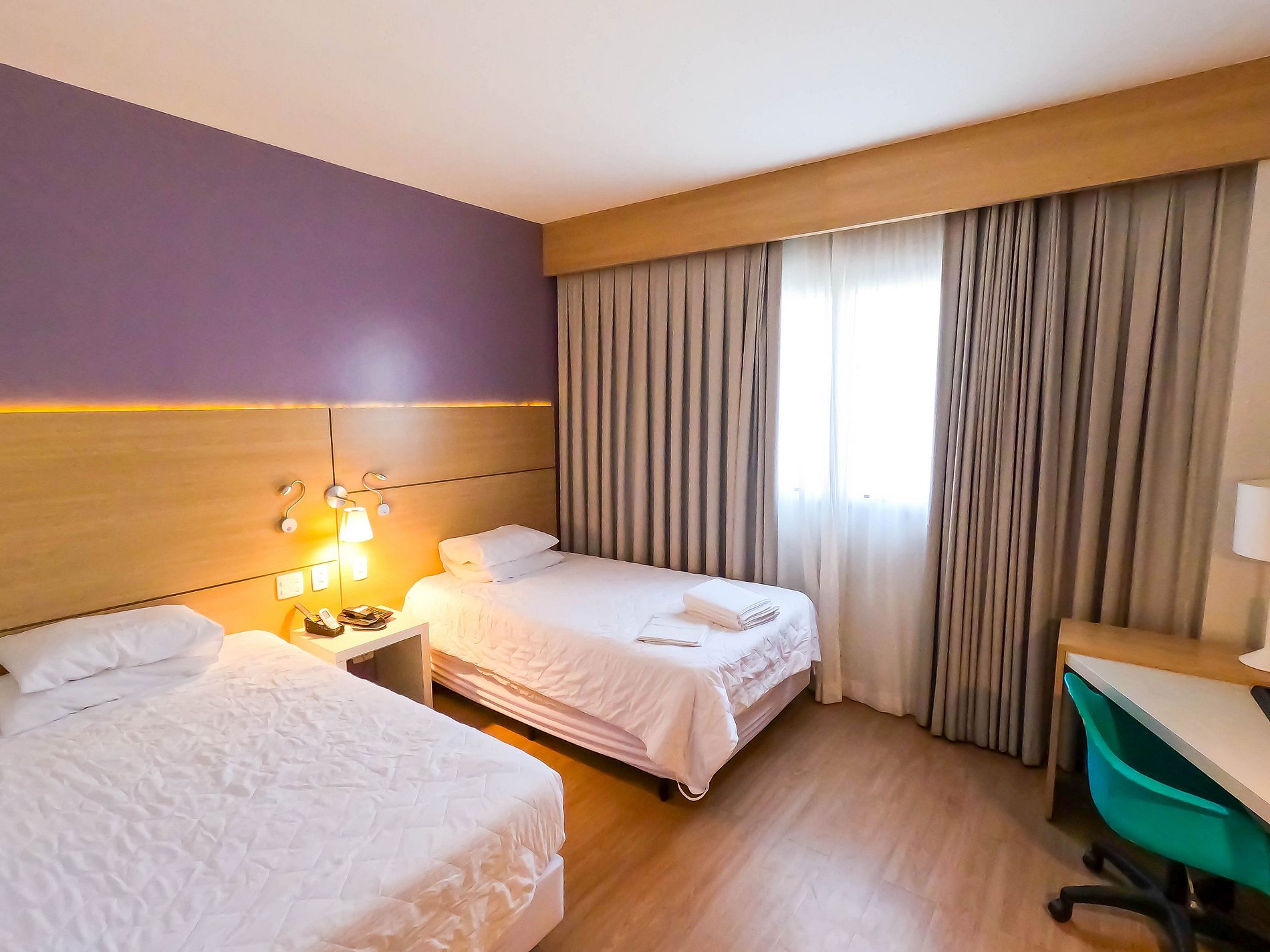 Possui 2 camas de viúva, que acomodam 2 adultos e 2 criancas (1 adulto e 1 criança em cada cama) ou até mesmo 2 casais pequenos. Arrumação de quarto todos os dias, recepção 24hr, tudo para que seu bem estar! Contamos com ar condicionado, cofre e Internet Wifi, além de Mesa de Trabalho, secador de cabelo, TV Smart.