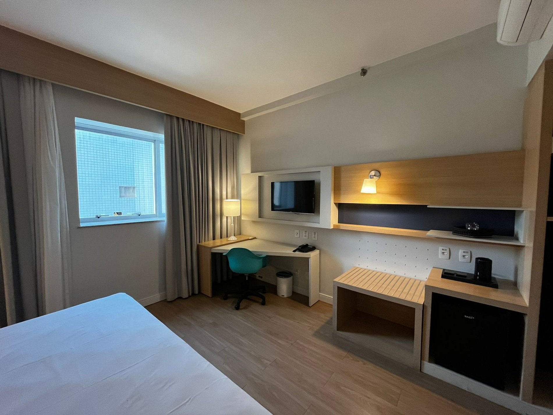 Possui uma cama King (super grande), que acomodam 2 adultos e 1 criancas de até 7 anos. Arrumação de quarto todos os dias, recepção 24hr, tudo para que seu bem estar! Contamos com ar condicionado, cofre e Internet Wifi, além de Mesa de Trabalho, secador de cabelo, TV Smart.