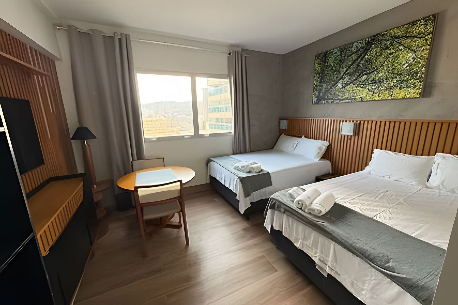 Possui cama 2 Camas de CASAL que acomodam até 4 adultos. Arrumação de quarto todos os dias, recepção 24hr, tudo para que seu bem estar! Contamos com ar condicionado, Internet Wifi, secador de cabelo, TV Smart, mini geladeira e muito mais.